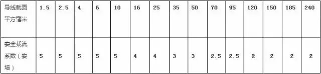 口诀(二)导线截面安全电流系数表: