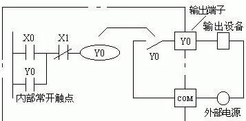 输出继电器是用来将plc内部信号输出传送给外部负载(用户输出设备)。输出继电器线圈是由PLC内部程序的指令驱动,其线圈状态传送给输出单元,再由输出单元对应的硬触点来驱动外部负载。如图4所示为输出继电器Y0的等效电路。