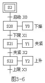 如图3-6所示,我们用机械手动作简单介绍状态器S的作用。当启动信号X0有效时,机械手下降,到下降限位X1开始夹紧工件,加紧到位信号X2为ON时,机械手上升到上限X3则停止。整个过程可分为三步,每一步都用一个状态器S20、S21、S22记录。每个状态器都有各自的置位和复位信号(如S21由X1置位,X2复位),并有各自要做的操作(驱动Y0、Y1、Y2)。从启动开始由上至下随着状态动作的转移,下一状态动作则上面状态自动返回原状。这样使每一步的工作互不干扰,不必考虑不同步之间元件的互锁,使设计清晰简洁。