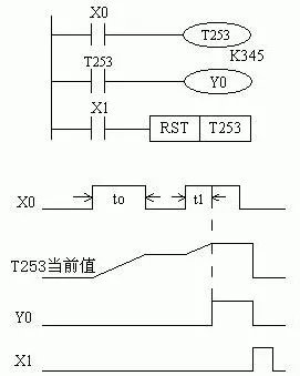 以下举例说明积算定时器的工作原理。如图2所示,当X0接通时,T253当前值计数数器开始累积100ms的时钟脉冲的个数。当X0经t0后断开,而T253尚未计数到设定值K345,其计数的当前值保留。当X0再次接通,T253从保留的当前值开始继续累积,经过t1时间,当前值达到K345时,定时器的触点动作。累积的时间为t0+t1=0.1×345=34.5s。当复位输入X1接通时,定时器才复位,当前值变为0,触点也跟随复位。