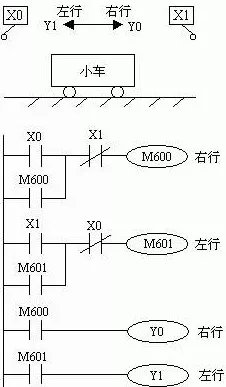 小车的正反向运动中,用M600、M601控制输出继电器驱动小车运动。X1、X0为限位输入信号。运行的过程是X0= ON→M600=ON→Y0=ON→小车右行→停电→小车中途停止→上电(M600=ON→Y0=ON)再右行→X1=ON→M600=OFF、M601=ON→Y1=ON(左行)。可见由于M600和M601具有断电保持,所以在小车中途因停电停止后,一旦电源恢复,M600或M601仍记忆原来的状态,将由它们控制相应输出继电器,小车继续原方向运动。若不用断电保护辅助继电器当小车中途断电后,再次得电小车也不能运动。