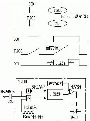 PLC中的定时器(T)相当于继电器控制系统中的通电型时间继电器。它可以提供无限对常开常闭延时触点。定时器中有一个设定值寄存器(一个字长),一个当前值寄存器(一个字长)和一个用来存储其输出触点的映象寄存器(一个二进制位),这三个量使用同一地址编号。但使用场合不一样,意义也不同。