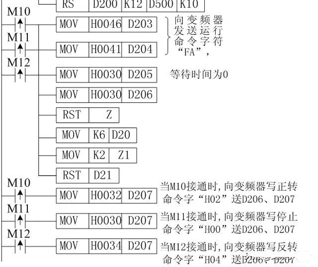 当M10、M11、M12任何一个接通时,PLC首先向变频器发出运行控制信号,D200~D209为发送数据的地址,其中D200存通信请求代码05H,D201、D202存变频器站号0,D203、D204存指令代码(运行命令字FAH),D205存等待时间(0ms),D206~D207存发送数据(D206、D207存正转02H/反转04H/停止00H),D208~D209存和校验码